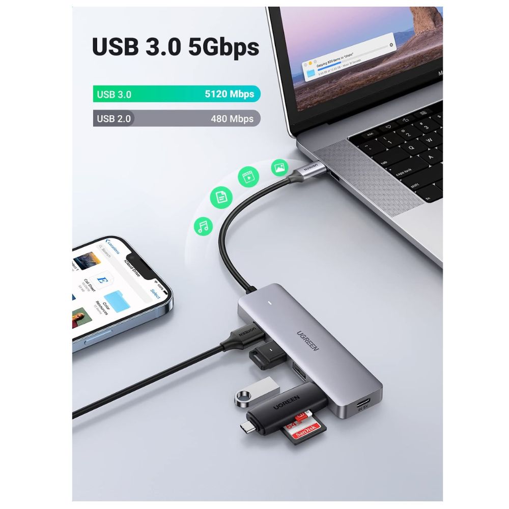 El concentrador de datos USB C de 4 puertos admite una transferencia de datos superrápida de hasta 5 Gbps, 10 veces más rápida que la del USB 2.0 (480 Mbps), lo que le permite transferir películas de alta definición o archivos grandes en sólo segundos.