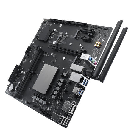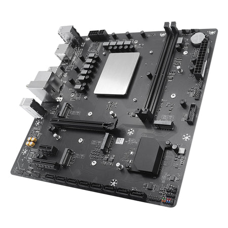 2 Ranuras de memoria DDR4 / maximo de 64GB, Almacenamiento 4 x M.2 Key-M slots / 8 x SATA 6Gb/s, Sonido Realtek High Definition Audio CODEC, 1 x Realtek 1 Gb, Formato Micro ATX.