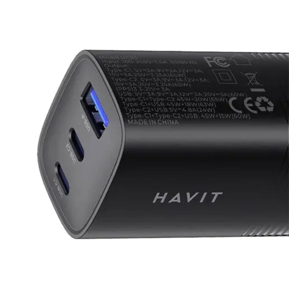 La potencia total puede alcanzar hasta 65 W, lo que hace que la carga eficiente sea un paso más rápida. La salida de puerto único USB-C puede alcanzar hasta PD65W; El puerto de salida USB-A admite QC3.0, la salida máxima de un solo puerto puede alcanzar los 27 W.