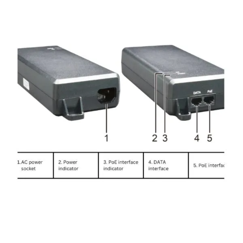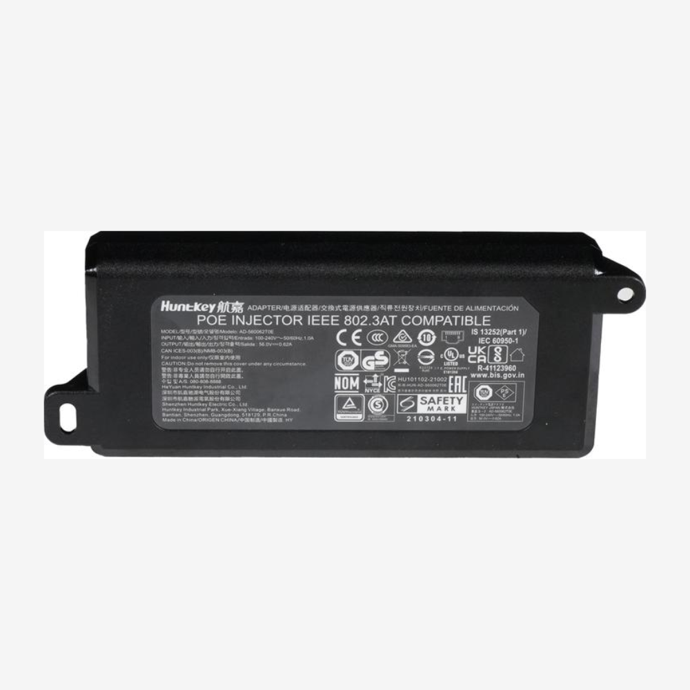 El AD-560062T0E permite suministrar energía (56 V DC, 35 W) y datos a dispositivos compatibles a través de un solo cable Ethernet — ideal para puntos de acceso WiFi, cámaras IP, o equipos de red que acepten alimentación PoE+ (802.3at).