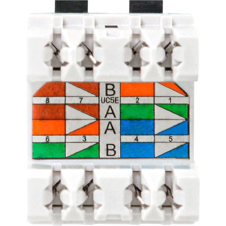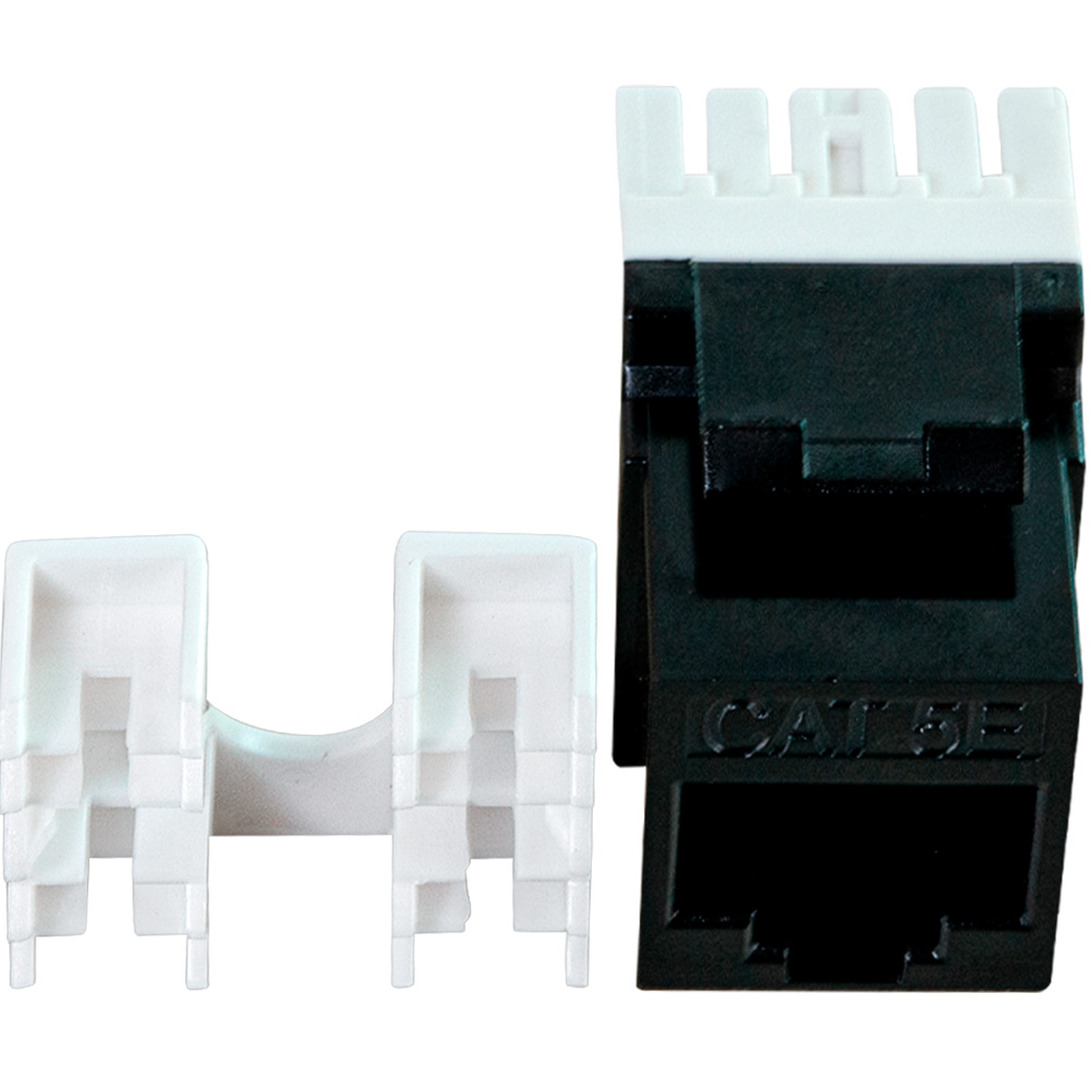 Conector hembra (jack) RJ45 tipo Keystone, de 8 contactos a 180°, color negro, de Categoría 5e. Se utiliza para colocar en placas o paneles de parcheo que se encuentran en lugares reducidos.