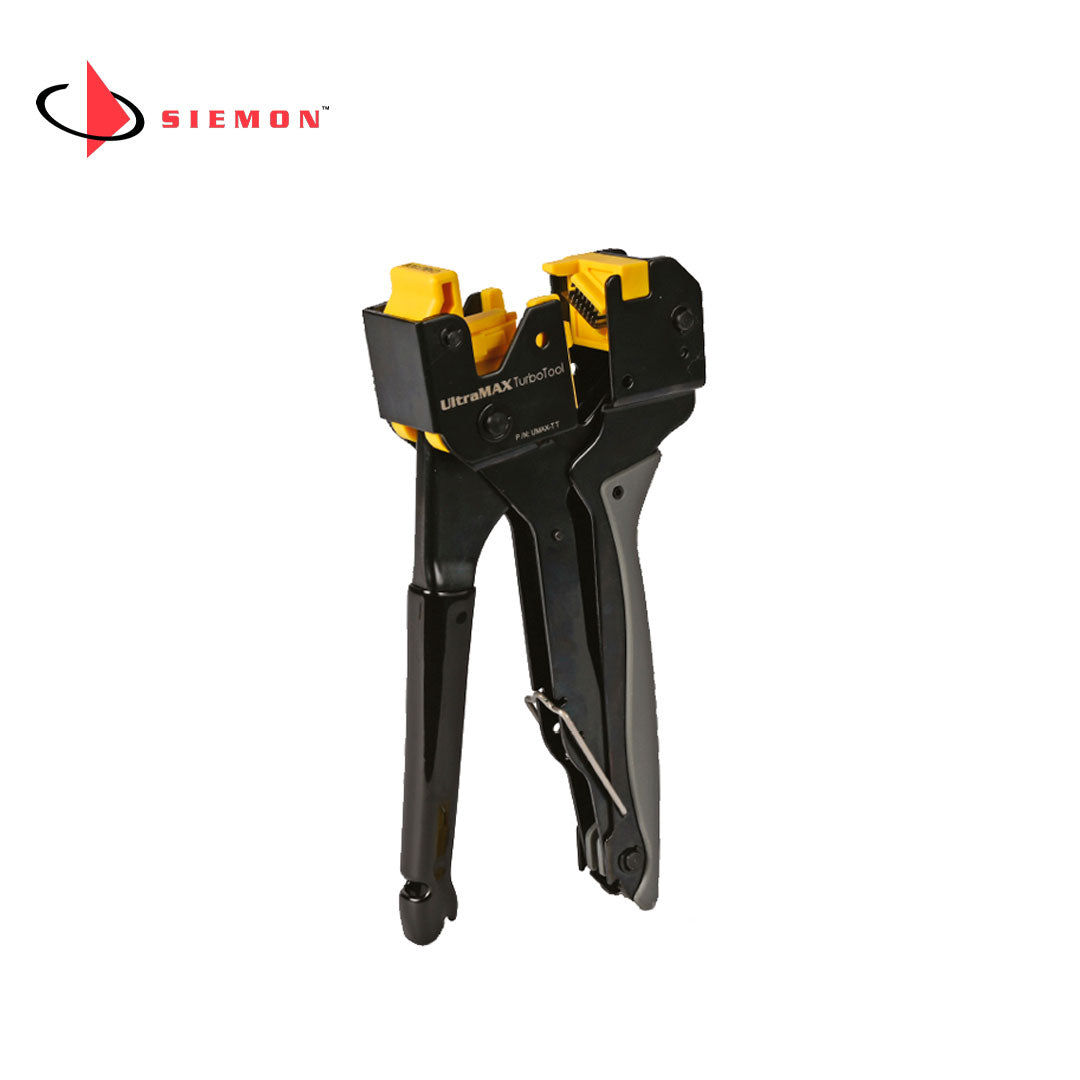herramienta de terminación específica de Siemon, conocida como UltraMAX TurboTool. Esta herramienta está diseñada para agilizar y simplificar la terminación de conectores hembra (jacks) UTP (par trenzado no blindado) de las categorías 5e, 6 y 6A de la línea UltraMAX de Siemon.