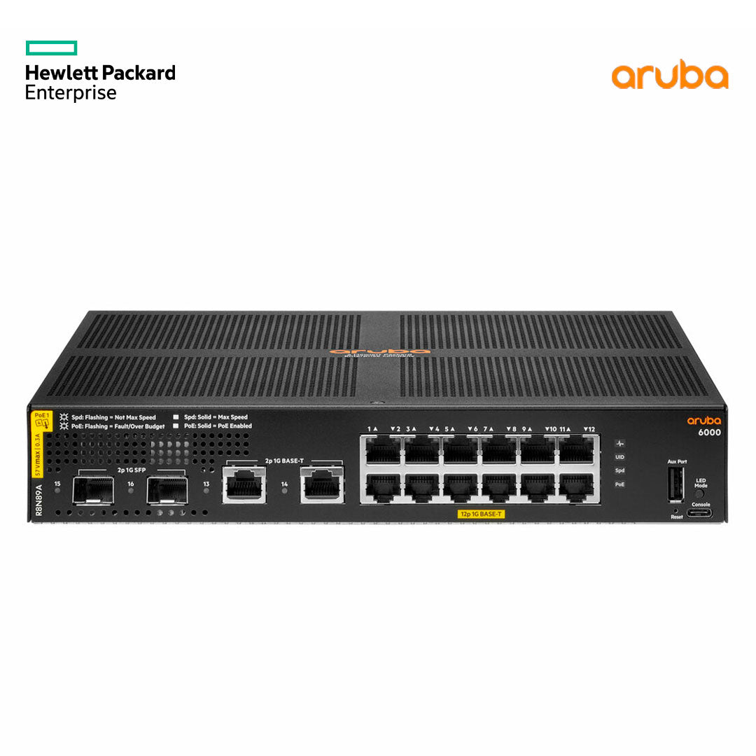 Switch HPE Aruba Networking 6000, 12G, Clase 4 PoE 2 G/2 SFP, 139 W