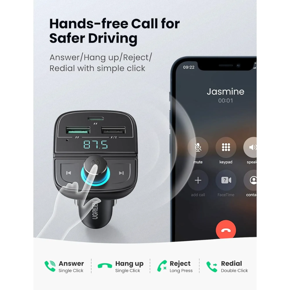 UGREEN 80910 - CD229 - TRANSMISOR FM - BLUETOOH - CARGADOR PARA CARRO - RANURA TARJETA TF